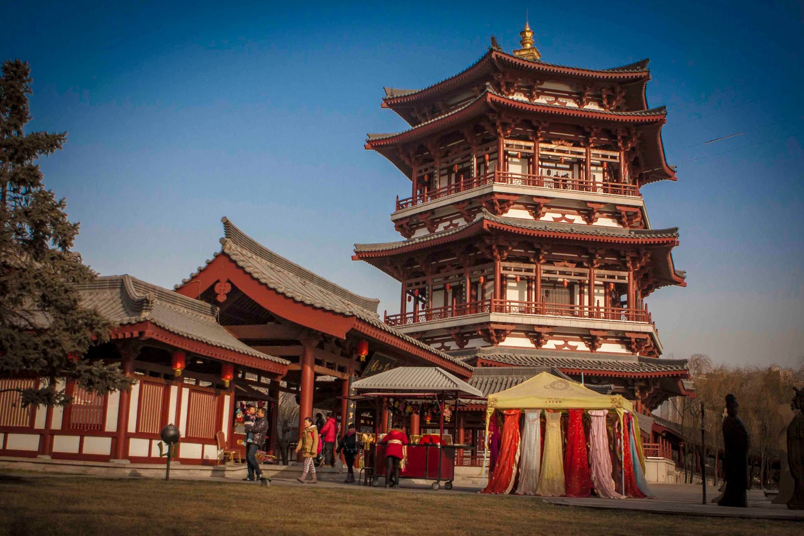 Kesäaikaan täällä voisi vuokrata myös polkuveneen yms aktiviteetteja, joita ei ainakaan jäätyneellä järvellä voi harrastaa. Kamelin vetämällä kärryllä voi kiertää alueen taikka sitten pienellä bussilla. Me kylläkin liikuimme jalan - alue ei ole niin iso, esimerkiksi verrattuna Daming Gongiin, eli Tang-dynastian kiellettyyn kaupunkiin. Arvelen, että Daming Gongista tulee jossain vaiheessa yhtä kiinnostava kohde kuin Tang paratiisi on, mutta tällä hetkellä 2013, valitsisin Tang Paratiisin ehdottomasti. Se myös sijaitsee lähellä Wind Big Goose Pagodaa, joten jos haluaa niin voi vierailla molemmilla alueilla samana päivänä. Kuitenkin molemmat ovat kokopäivän kohteita, joten laittaisin niihin 2 päivää, jos vaan aikataulu sallii.